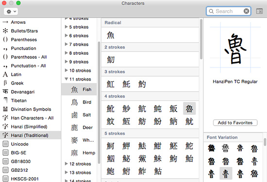 - Hanzi (Traditional) displays the Big-5 character set by radical-stroke.