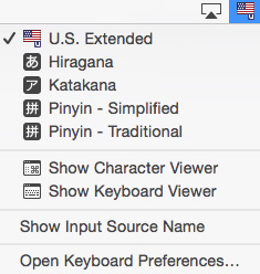 To activate a keyboard or input method, choose it from the menu. Its icon will appear in the Menu bar and it will have a check mark beside it in the menu. In the above example, the U.S. Extended keyboard is followed by two Japanese input modes, the two Chinese Pinyin input modes, and the Character Viewer.