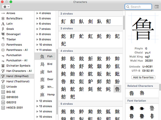 - Hanzi (Traditional) displays the Big-5 character set by radical-stroke.