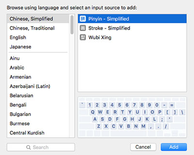 Then use the + sign to activate the Chinese input methods you want to use and cause them to appear in the Input menu: