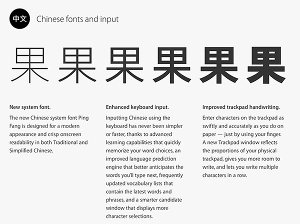 - There is a new Chinese system font, PingFang, to go along with the new overall system font, San Francisco.