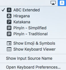 To activate a keyboard or input method, choose it from the menu. Its icon will appear in the Menu bar and it will have a check mark beside it in the menu. In the above example, the U.S. Extended keyboard is followed by two Japanese input modes, the two Chinese Pinyin input modes, and the Character Viewer.