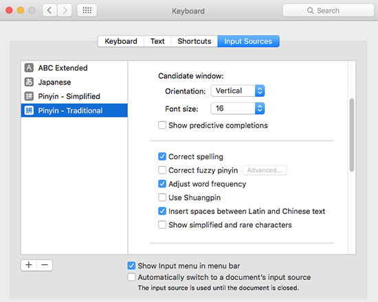 Then use the + sign to activate the Chinese input methods you want to use and cause them to appear in the Input menu: