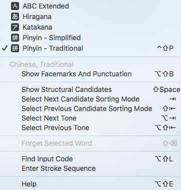 To access this Help, select an input mode in the Input menu. Its extended menu will appear, with Help at the bottom. Traditional-Chinese Pinyin, for example, looks like this: